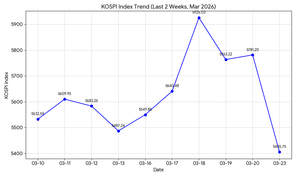 • '블랙 먼데이' 발생: 3월 23일(월), 미국과 이란 간의 갈등 격화와 호르무즈 해협 봉쇄 위협으로 인해 전 거래일 대비 6.49% 폭락한 5,405.75로 마감했습니다. 이는 원/달러 환율이 1,500원을 돌파하는 등 외환 시장의 불안과 맞물려 외국인과 기관의 강력한 매도세를 불렀습니다.