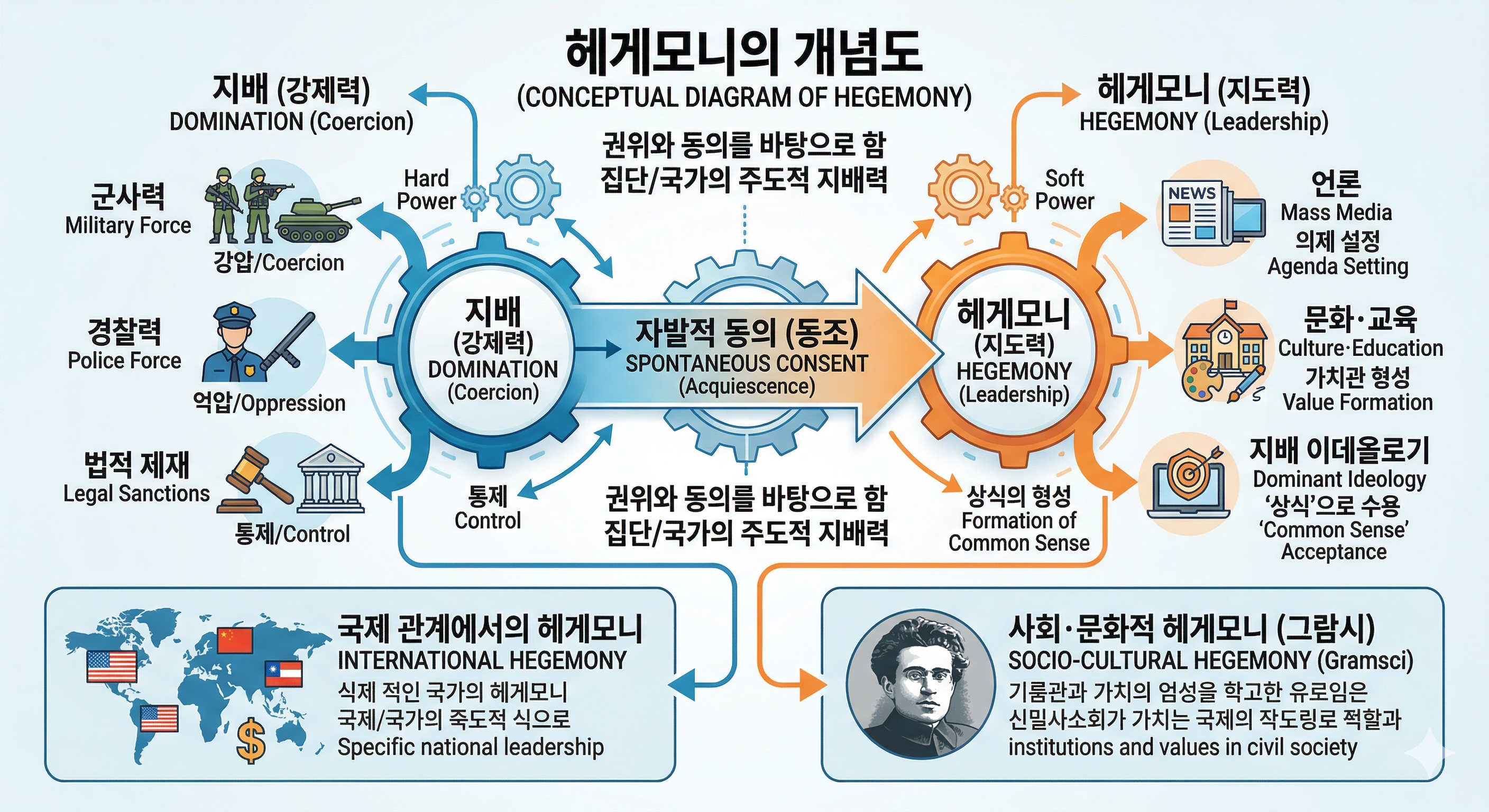 - 동의에 의한 지배: 지배 계급이 물리적인 힘(경찰, 군대)뿐만 아니라 문화, 교육, 언론, 가치관 등을 통해 피지배 계급으로부터 '자발적인 동의'를 얻어내는 것을 말합니다.