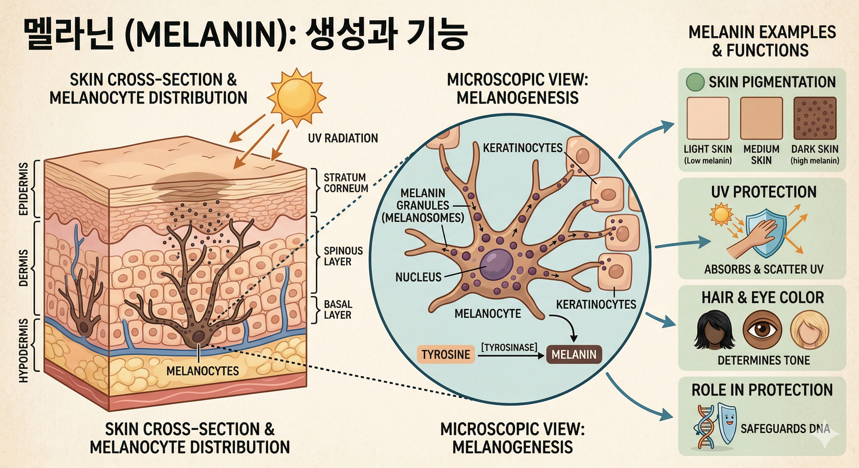 멜라닌은 피부 표피 기저층에 있는 **멜라노사이트(Melanocyte, 멜라닌 세포)**에서 만들어집니다.