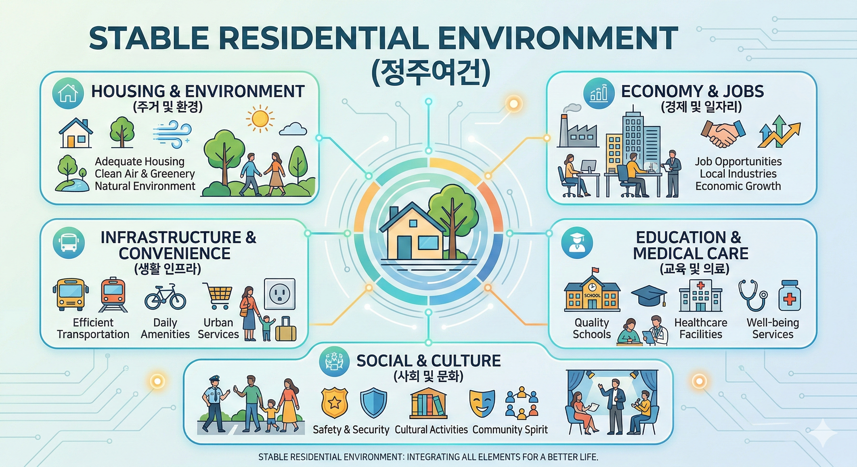 **정주여건(定住條件)**은 사람이 특정 지역에 부리를 내리고 계속 살아가기에 필요한 모든 환경적 요소를 의미합니다. 단순히 '집'이라는 물리적 공간을 넘어, 삶의 질을 결정하는 종합적인 지표로 활용됩니다.