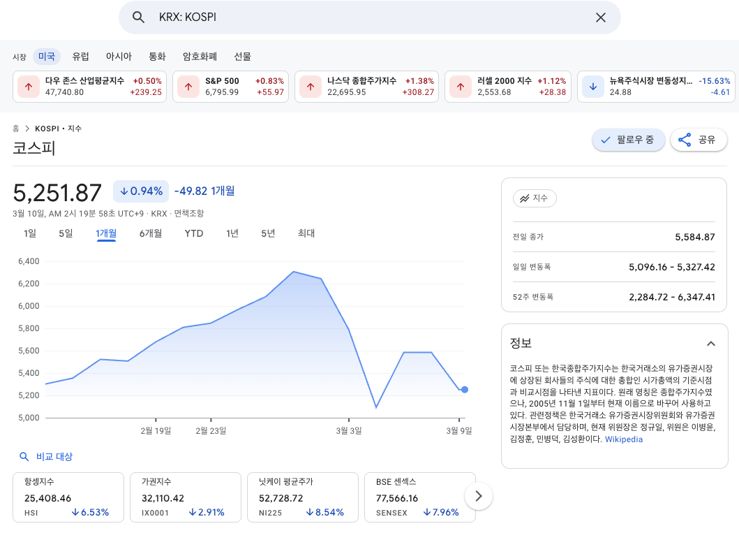 - 2026년 3월 9일: 유가 급등(100달러 돌파) 쇼크와 반도체 대형주(삼성전자, SK하이닉스)의 급락으로 코스피 지수가 7% 가까이 빠지며 매도 사이드카가 발동되었습니다.