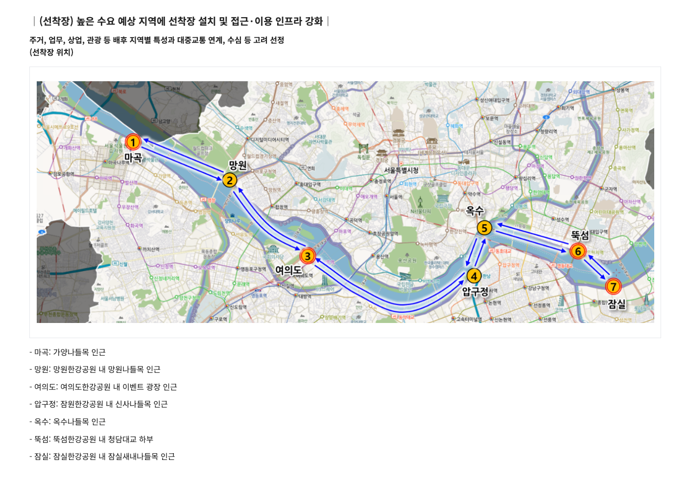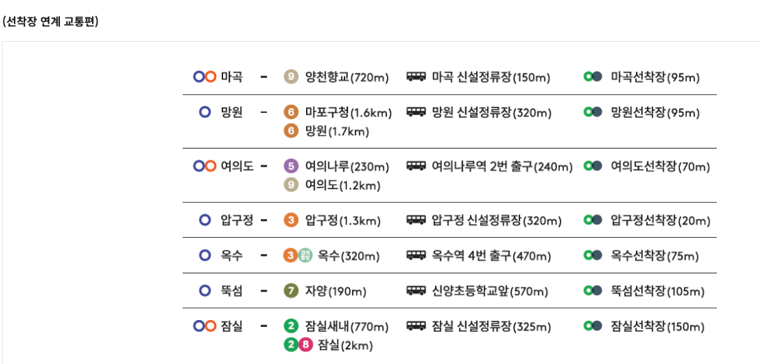 - 선착장: 마곡 - 망원 - 여의도 - 안반포 - 이촌 - 옥수 - 잠실