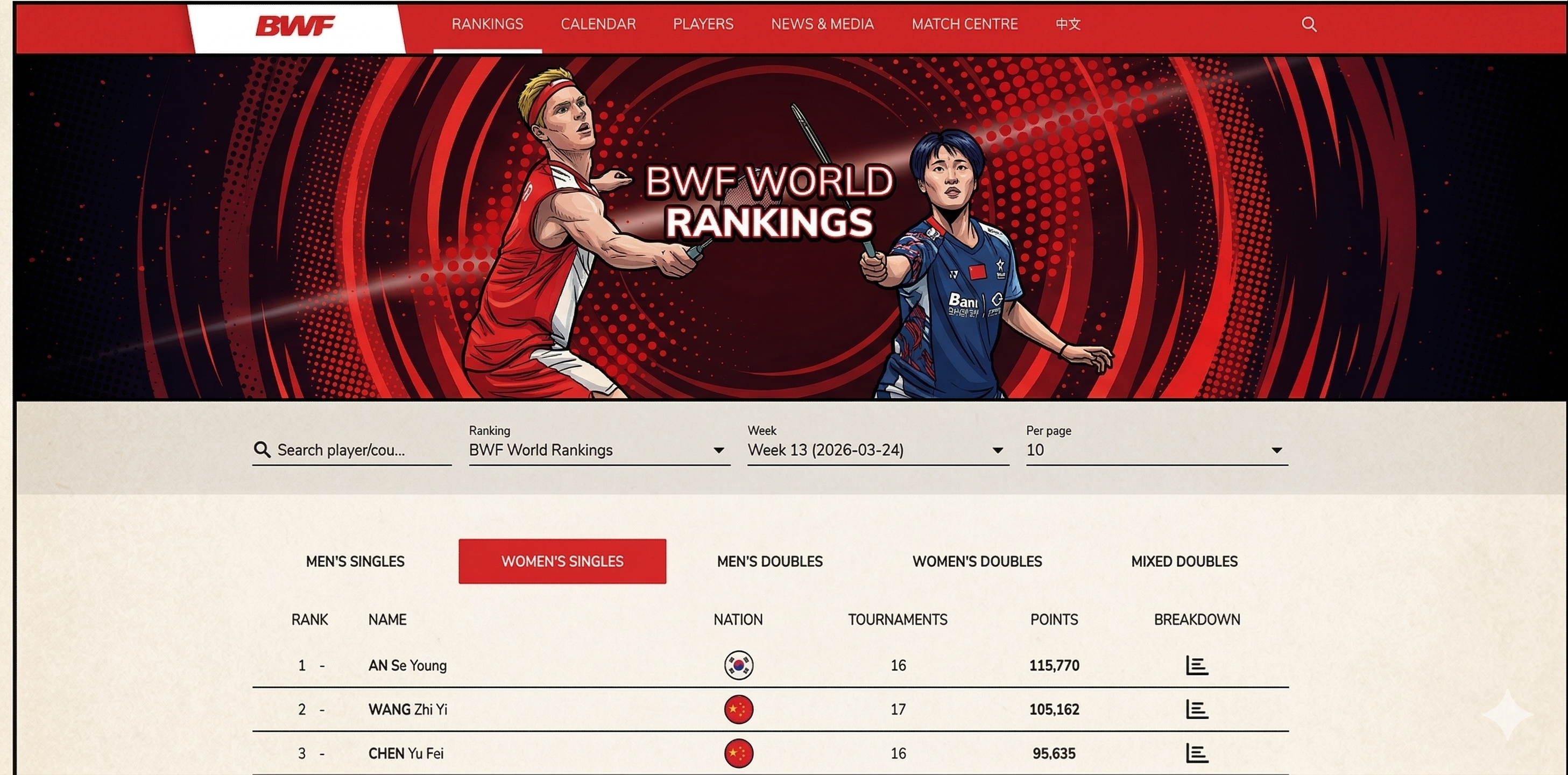 2026년 3월 말 기준, 세계배드민턴연맹(BWF)에서 발표한 여자 배드민턴 세계 랭킹